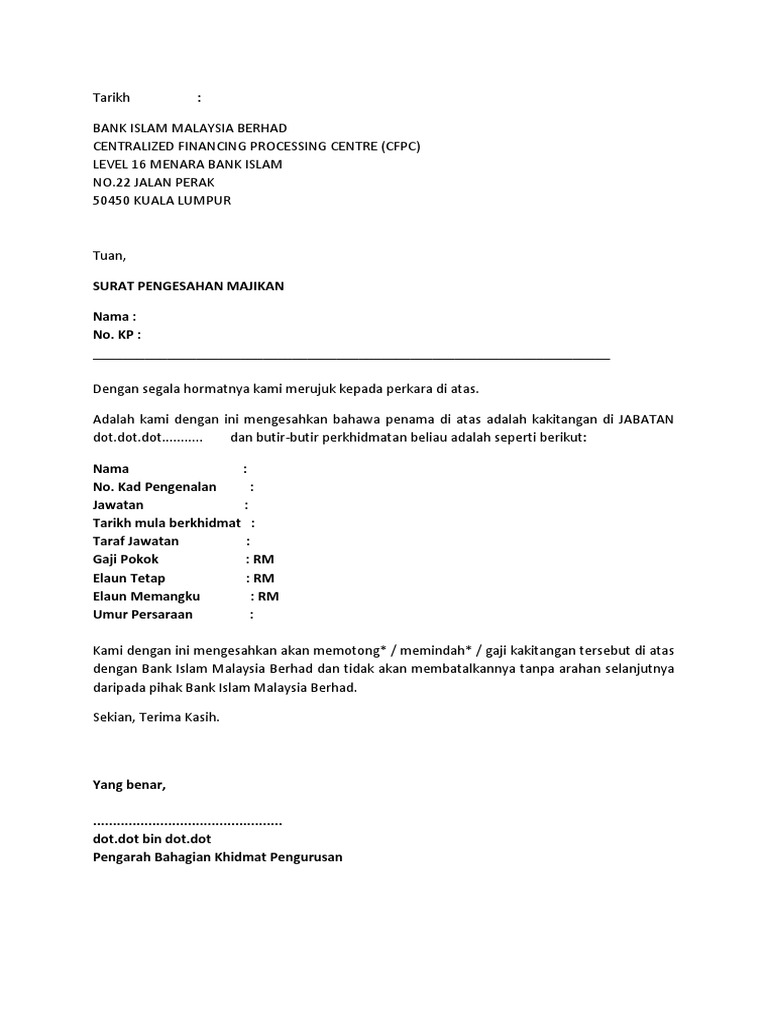 Contoh surat pengesahan jawatan swasta contoh surat pengesahan dari majikan untuk kakitangan kerajaan dan swasta. BHD sebagai pekerja am dengan purata pendapatan sebanyak RM. Surat Perletakan Jawatan.